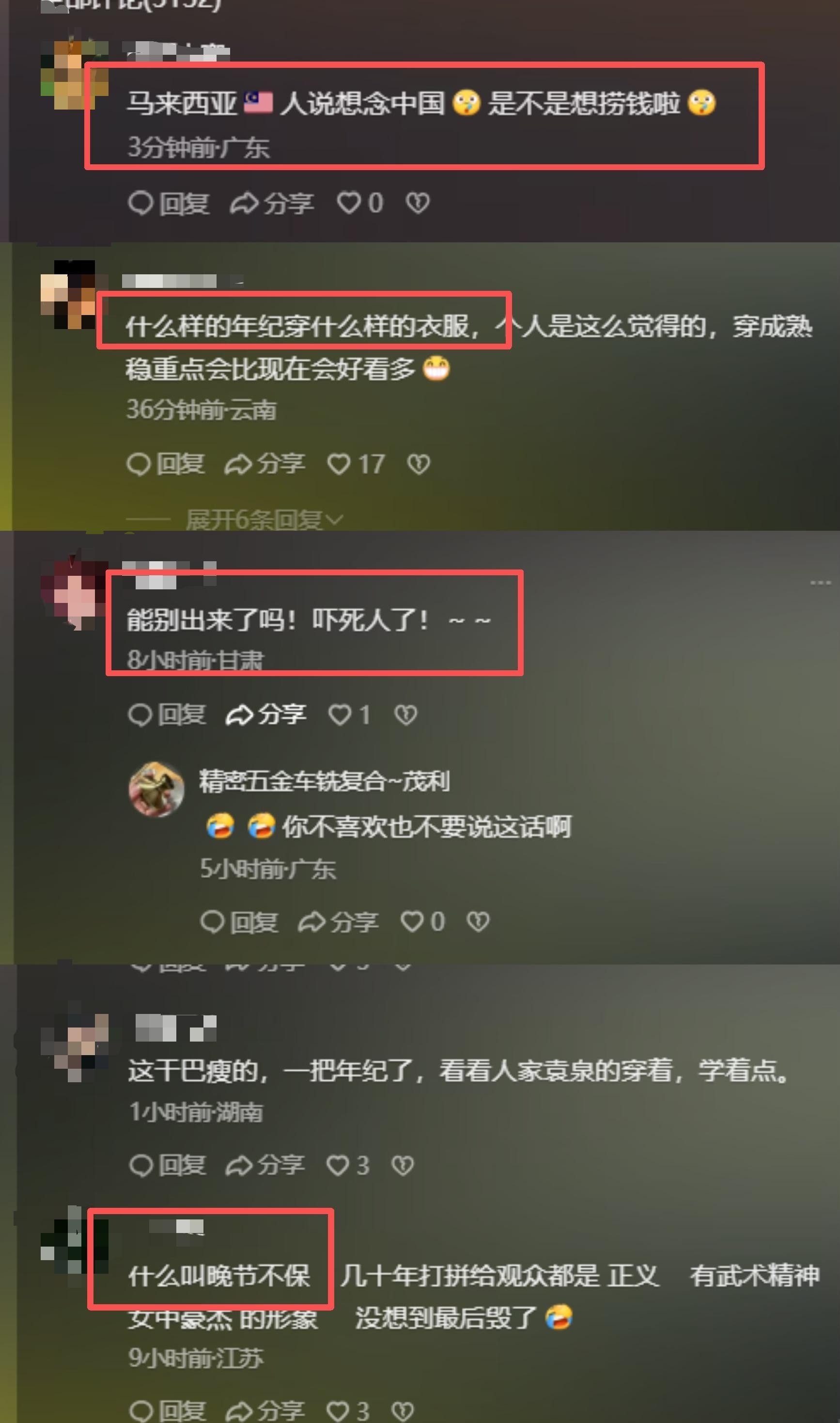 “马来西亚人说想念中国,是不是想捞金?”“这个年纪还穿成这样,是对观众眼睛的不尊重”“晚节不保”等侮辱性言论频频出现。